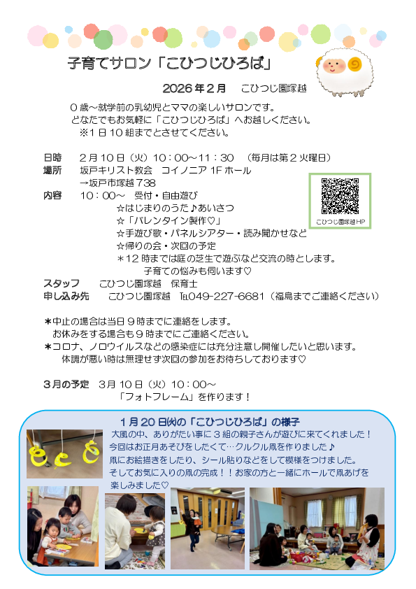 毎月第2火曜日に0歳~就学前の乳幼児とママの楽しいサロンを始めました。 どなたでもお気軽に「こひつじひろば」にお越しください。